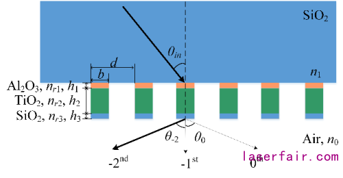 該項研究中,研究人員利用簡化模式方法從(cong) 理論上分析了負二級高效率產(chan) 生的條件,通過求解色散方程得到各個(ge) 模式的有效折射率,對各個(ge) 傳(chuan) 播模式進行分析進而得到-2級高效率的條件表達式和光柵結構的初始參數,並通過嚴(yan) 格耦合波算法和模擬退火優(you) 化算法對其參數進行進一步優(you) 化設計,得到了-2級超寬帶高效率衍射光柵器件。