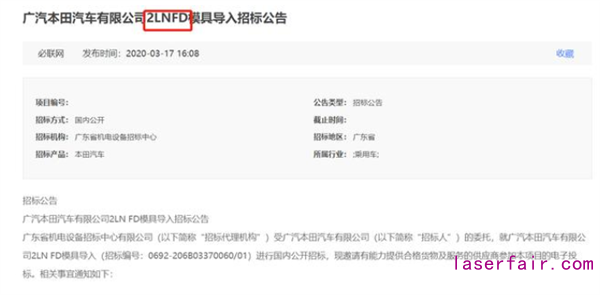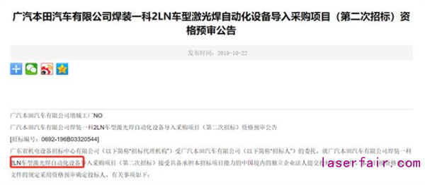 事實上,廣本從(cong) 去年下半年就有所動作。因為(wei) 在10月份之前,其工廠焊裝一科2LN車型激光焊自動化設備導入采購項目就進行了二次招標。招標內(nei) 容為(wei) WE1 2LN車型激光焊自動化設備導入。