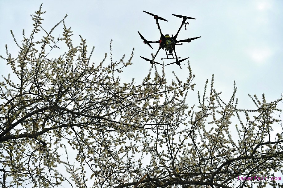 3月25日,果農(nong) 用無人機給盛開的杏花授粉。今年,阿拉爾市大力發展智慧農(nong) 業(ye) ,87萬(wan) 畝(mu) 杏、紅棗、蘋果普遍采用無人機授粉、施肥,此舉(ju) 可以大幅度提高果品產(chan) 量和質量。孫國權攝