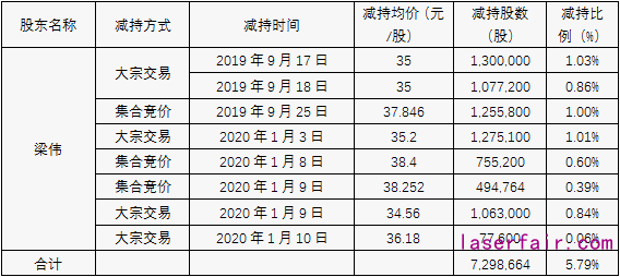 3月25日,金運激光發布公告:截至2020年3月24日,公司實際控製人梁偉(wei) 減持股份計劃實施時間屆滿。梁偉(wei) 在此次減持期間內(nei) ,共計減持公司股票761萬(wan) 股,占公司總股本的6.04%。此次減持完成後,梁偉(wei) 先生及其一致行動人共計持有公司46.54%股票。