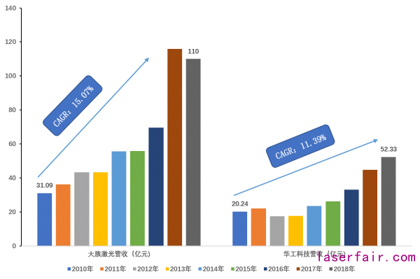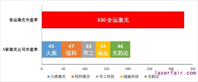而與(yu) 其他在A股上市的激光企業(ye) 對比,金運激光市盈率是大族激光、銳科激光、光韻達7倍多,是福晶科技9倍多、是華工激光10倍。而大族激光、銳科激光、華工科技、福晶科技、光韻達五家公司市盈率總和都不及金運激光三分之二。