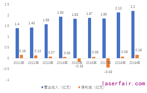 相對於(yu) 330倍的市盈率,金運激光營業(ye) 收入和淨利潤卻是增長緩慢,利潤微薄。2011年上市至今已有9年時間,但金運激光營業(ye) 收入僅(jin) 從(cong) 1.4億(yi) 元增長到2019年的2.2億(yi) 元,年複合增長率隻有5.15%,年淨利潤長期處於(yu) 1000萬(wan) 以下,上市9年利潤總額隻有0.13億(yi) 元。反觀同期的大族激光,營業(ye) 收入從(cong) 2010年31.09億(yi) 元增長到2018年的110億(yi) 元,年複合增長率達到15.07%,華工科技營業(ye) 收入也從(cong) 2010年20.24億(yi) 元增長到2018年的52.33億(yi) 元,年複合增長率達到11.13%,皆遠超金運激光。