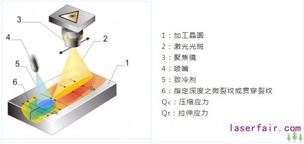 LCT製程基礎是激光光斑沿晶圓切割線進行加熱,隨後再以致冷劑冷卻受熱處。激光輻射照射材料表麵會(hui) 使外層產(chan) 生顯著的壓縮應力,但不會(hui) 造成斷裂。正因致冷劑促使局部劇烈冷卻,所形成之溫度梯度導致表麵層產(chan) 生拉伸應力,才得以使裂紋推進(如圖1)。