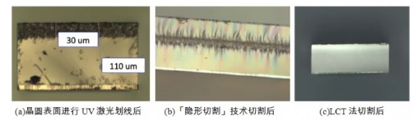 取LCT法切割晶圓後所得之藍寶石芯片斷麵照片進行比較(如圖4),可見LCT明顯優(you) 於(yu) 其他熟知的競爭(zheng) 技術;其切割速度介於(yu) 30~500 mm/s間,視藍寶石厚度(30~1000 μm)而定。一般來說,藍寶石在一個(ge) 工藝周期內(nei) 即一刀切穿,僅(jin) 在某些情況下會(hui) 於(yu) 占材料厚度10~30%處先行作出初始微裂,再以激光或機械劈裂完成切割,如藍寶石防護屏閉環切割便建議依前述方式操作。