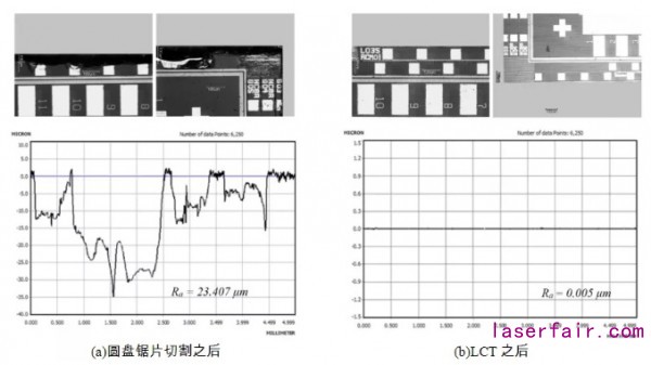 將鑽石圓盤鋸片及LCT切割後之芯片斷麵品質進行比較,並以型號XP-200的Ambioses(美國)表麵光度儀(yi) 測量芯片工作斷麵的表麵粗糙度(如圖5),鋸片切割後為(wei) Rа= 23.407 μm,而LCT後則不大於(yu) Rа~0.005μm。