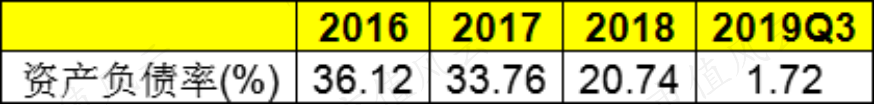 公司資產(chan) 負債(zhai) 率呈下降趨勢,從(cong) 2016年的36.12%下降至2018年的20.74%,上市募資後,2019年三季度末資產(chan) 負債(zhai) 率下降至1.72%。