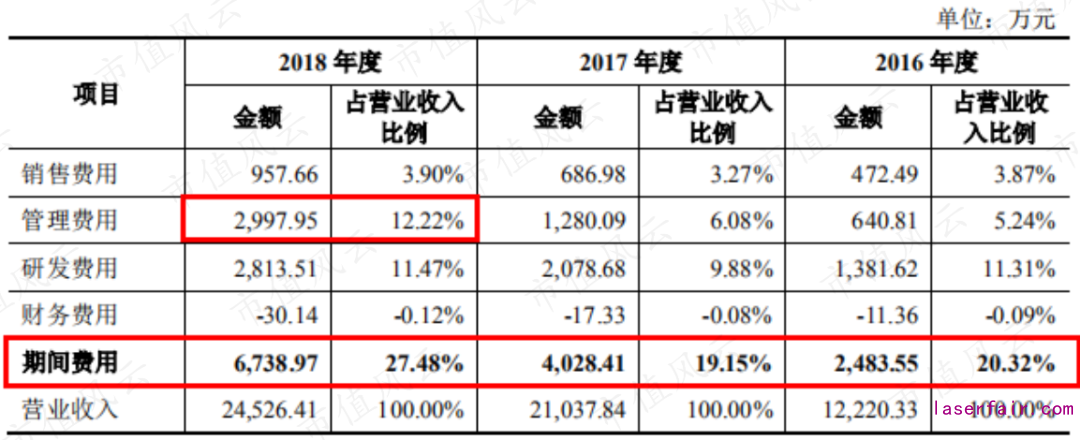 期間費用率在2018年大幅上升主要因為(wei) 公司當期完成高級管理人員、核心技術人員持股,股份支付公允價(jia) 差確認管理費用1103萬(wan) 。