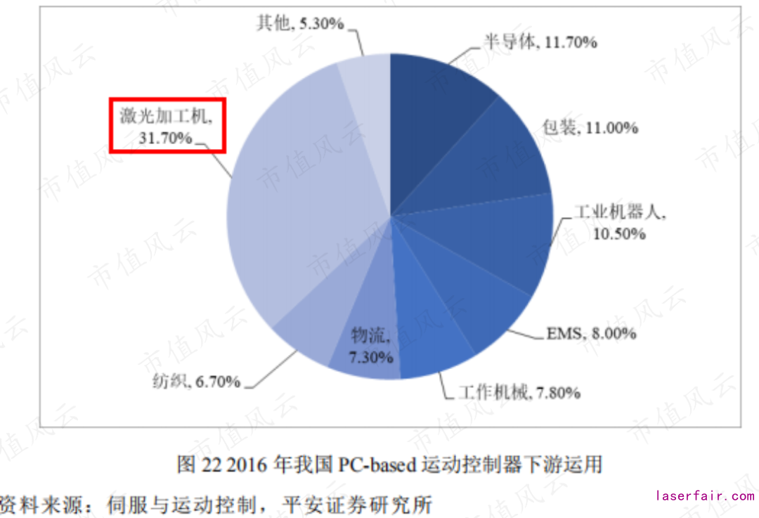 在我國,PC-based運動控製器下遊應用最多的是激光加工機領域,2016年在所有應用領域中占比31.7%。