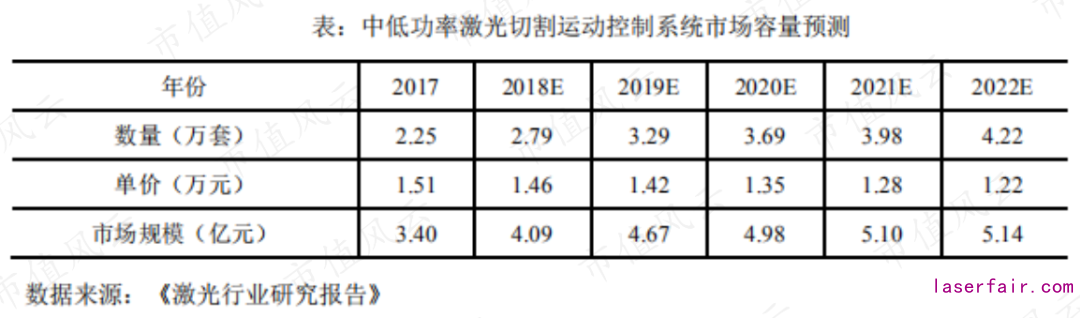 根據《激光行業(ye) 研究報告》,中低功率激光切割設備銷售數量增速由2017年的59.57%降至2018年的24.44%,2018年中低功率激光切割運動控製係統市場容量增長率為(wei) 20.29%,整體(ti) 市場增速放緩。