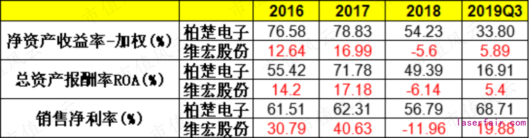 柏楚電子在2019年三季度末ROA為(wei) 16.91%,而維宏股份上市後的頭兩(liang) 年ROA分別為(wei) 14.2%、17.18%,較為(wei) 接近。