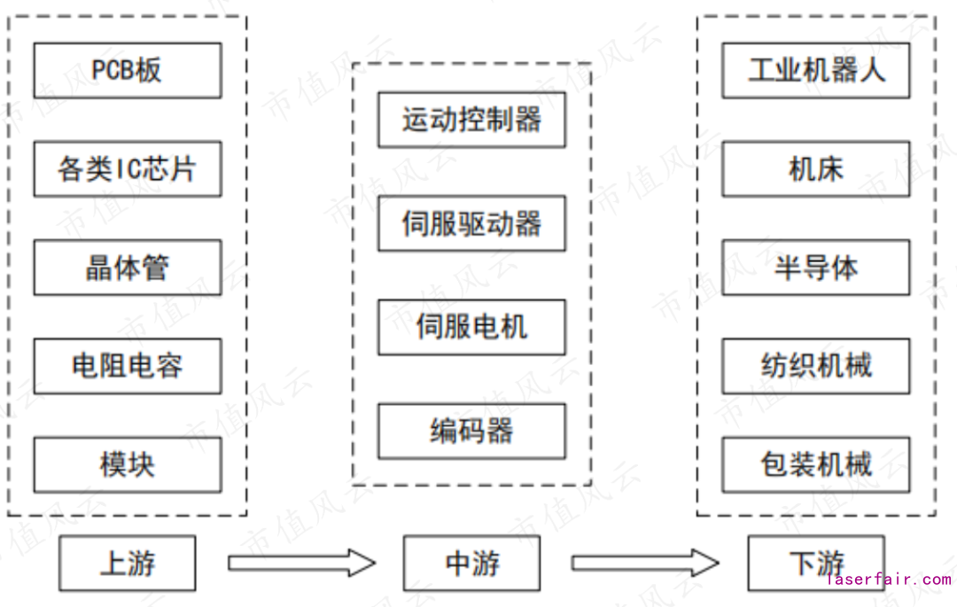 運動控製係統行業(ye) 的上遊是諸如PCB板、IC芯片、晶體(ti) 管、電阻電容等電子元器件生產(chan) 商。中遊包括核心部件運動控製器、伺服驅動器、伺服電機等。