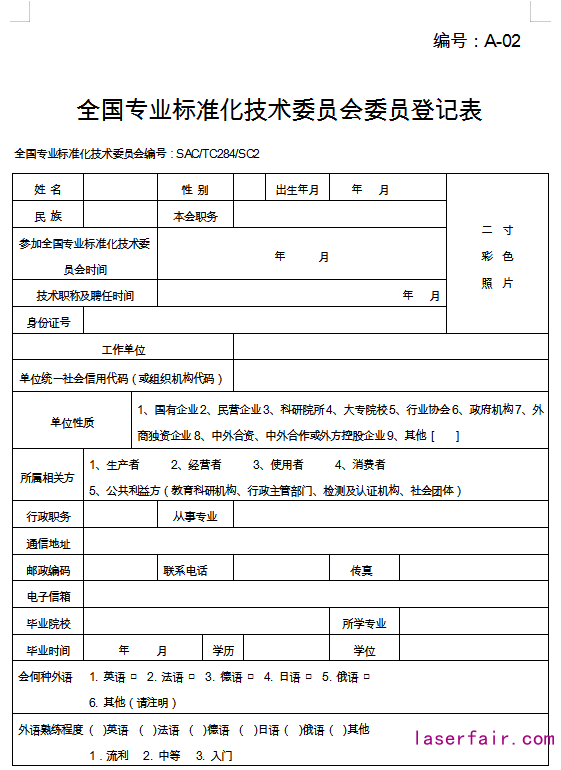 附件:全國專(zhuan) 業(ye) 標準化技術委員會(hui) 委員登記表編號:A-02 全國專(zhuan) 業(ye) 標準化技術委員會(hui) 委員登記表全國專(zhuan) 業(ye) 標準化技術委員會(hui) 編號:SAC/TC284/SC2 姓 名性 別出生年月年 月二...