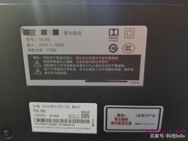 在某激光電視的主機信息上,我們(men) 可以很明顯地看到"鏡頭發出的強光可能傷(shang) 害眼睛"、"警告!激光輻射,請勿直視光束"等字樣,這也直接讓"激光電視不傷(shang) 眼"的說法不攻自破。既然廠商都在自己產(chan) 品上明確標注激光危害了,那又何來不傷(shang) 眼一說呢?