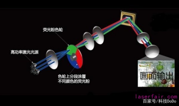然而受限於(yu) 技術及成本等諸多因素,市麵上大部分激光電視並不能發出RGB三原色激光,大多都采用的是藍色半導體(ti) 激光發生器,也就是常說的單色激光電視。這種激光電視的工作原理是將藍色激光通過熒光粉色輪高速旋轉,形成紅色、綠色兩(liang) 種光源,再通過DMD芯片、解析鏡頭將畫麵輸出到激光電視的屏體(ti) 上。