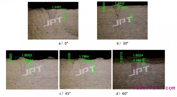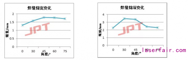 通過實驗數據看出,焊縫熔深隨著吹氣角度的增大先增大,後減小,在0°或大於(yu) 45°時,熔深都快速減小,當吹氣角度為(wei) 30°時,焊縫熔深達到最大。
