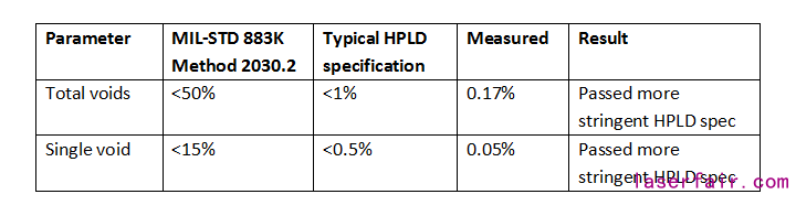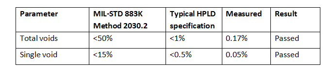 空洞百分比的結果總結體(ti) 現在表4中。貼片後空洞百分比超過了MIL-STD 883K方法2030.2規範,達到了更嚴(yan) 格的HPLD指標。