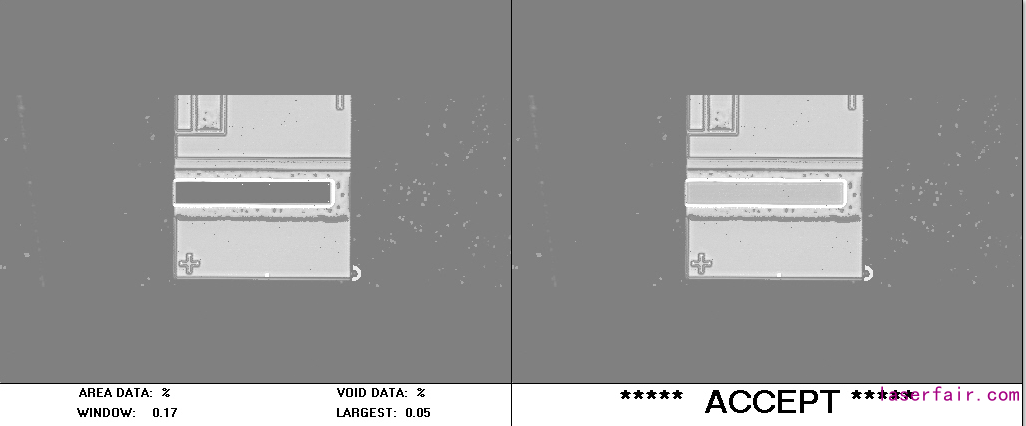 除了幾何位置分析之外,我們(men) 還對樣品進行了超聲掃描顯微鏡(SAM)測試,以檢測焊接界麵中的空洞百分比。圖3描繪了對單管激光芯片(4mm x500μmx120μm)AuSn共晶貼片到AlN基板在Sonoscan D-9000係列C-SAM機器上拍攝的圖像。