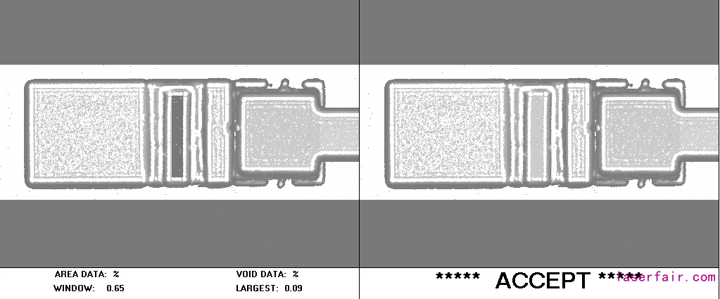 左圖是經過處理的圖像,右圖是使用Sonoscan D-9000 C-SAM機器測量的原始圖像,該表顯示了空洞率百分比的結果。 如表中所示,貼片後的空洞率超過了MIL-STD 883K方法2030.2規範,並且還通過了更嚴(yan) 格的HPLD空洞率指標。