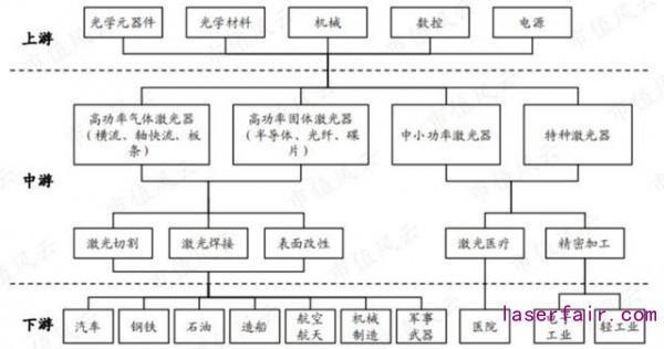 再來看看激光產(chan) 業(ye) 鏈。上遊主要包括激光材料及配套元器件,中遊為(wei) 激光器製造,下遊則以激光裝備、應用產(chan) 品、消費產(chan) 品為(wei) 主。總的來說,我國初步形成了較成熟的激光產(chan) 業(ye) 鏈。