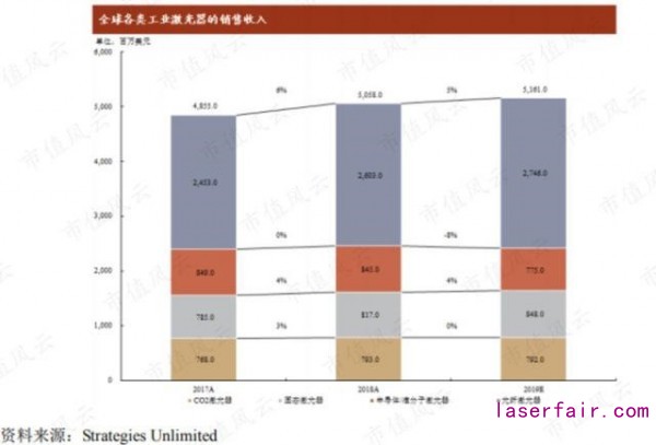 根據Strategies Unlimited統計,2018年全球各類工業(ye) 激光器銷售收入50.58億(yi) 美元,同比增長4%。2019年預計收入51.61億(yi) 美元,其中貢獻最大的是光纖激光器(增益介質是玻璃光纖的激光器),預計收入達到27.46億(yi) 美元。