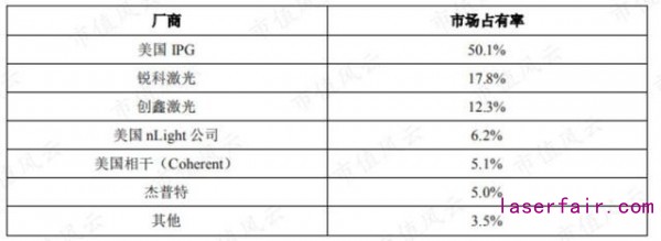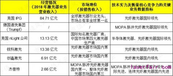 國內(nei) 激光器廠商產(chan) 品大多以調Q結構為(wei) 主,如銳科激光、創鑫激光。而公司是全國首家商業(ye) 化生產(chan) MOPA脈衝(chong) 光纖激光器的廠商,與(yu) 國內(nei) 其他廠商形成了差異化競爭(zheng) 。競爭(zheng) 主要來自國外激光器生產(chan) 商,如美國IPG、德國Trumpf集團。