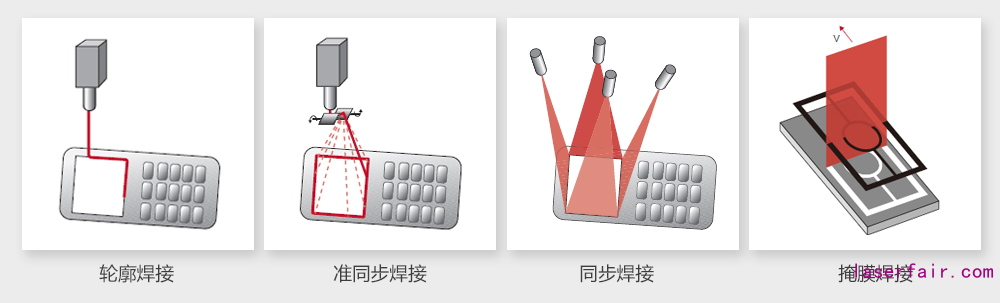 塑料激光焊接應用方式和金屬焊接不同,根據不同的焊接任務和要求,激光焊接的方式大致有輪廓焊接、準同步焊接、同步焊接、掩膜焊接、反射焊接和衍射焊接等。聯贏激光可以根據產(chan) 品特性提供相應的焊接方式方案。原理圖示意如下: