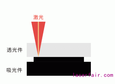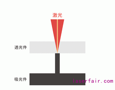 兩(liang) 種或兩(liang) 種以上的(同種或異種)塑料部件,通過激光光束穿透上層透光材料,透射到下層吸光材料,兩(liang) 部件受熱膨脹,激光能量被下層吸光部件吸收轉化為(wei) 熱能,熔化其表麵,再通過熱傳(chuan) 導,將熱能傳(chuan) 遞到上層透光部件上,在內(nei) 部膨脹力與(yu) 外部夾具壓力的協同作用下產(chan) 生充分熔合,完成上下部件的牢固焊接。激光光束和焊接部件的相對移動形成焊縫。其焊接原理如下圖所示: