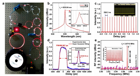 基於(yu) 數值模擬的結果,課題組采用Pr/Yb共摻ZBLAN光纖作為(wei) 可見光增益介質,利用非線性放大環鏡作為(wei) 鎖模器,首次實驗實現了小型化可見光被動鎖模光纖激光器,獲得鎖模中心波長為(wei) 635 nm(紅光)的皮秒脈衝(chong) 激光(見圖2)。該研究成果是在可見光範圍內(nei) 向小型化超快光纖激光器邁出的重要一步。將為(wei) 可見光超快光纖激光在精密光譜學、生物醫學、顯微成像、光通信、科學研究等領域的應用奠定基礎,具有很好的研究潛力和應用價(jia) 值。