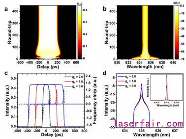 圖1.可見光被動鎖模光纖激光器的數值模擬結果。(a)脈衝(chong) 演化;(b)相應的光譜演化;(c)脈衝(chong) 時域波形(實線)和相應的頻率啁啾(虛線);(d)鎖模激光光譜