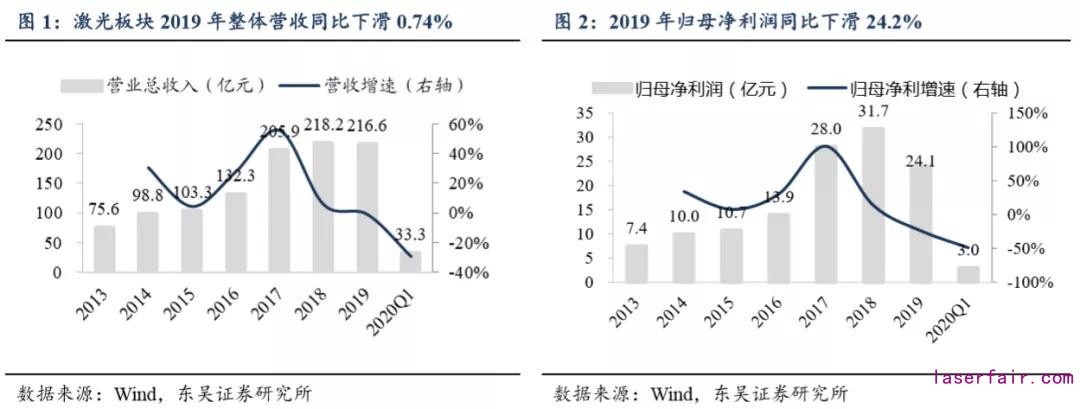激光板塊2019年受下遊需求放緩+激光器價(jia) 格戰影響,整體(ti) 業(ye) 績依然承壓。2019 年 激光設備板塊共實現營收 216.6 億(yi) 元,同比-0.74%,歸母淨利潤 24.1億(yi) 元,同比-24.2%,2019年受宏觀經濟影響,下遊廠家投資意願減弱,國內(nei) 激光設備市場增速持續放緩,市場競爭(zheng) 愈加激烈。同時,中遊激光器價(jia) 格戰也導致產(chan) 品盈利承壓。