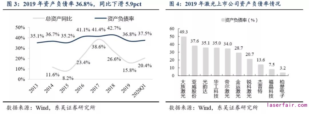 總資產(chan) 同比增長15.8%,保持穩健增長。2019年激光設備板塊資產(chan) 共計429.6億(yi) 元,同比+15.8%,板塊資產(chan) 負債(zhai) 率為(wei) 36.8%,同比-5.9pct,主要受柏楚電子、帝爾激光、傑普特上市募資大幅降低資產(chan) 負債(zhai) 率及大族激光本年度歸還短期借款較多致負債(zhai) 大幅減少所致;2020Q1激光設備板塊資產(chan) 共計439.6億(yi) 元,同比+20.4%,板塊資產(chan) 負債(zhai) 率為(wei) 37.5%,同比-4.4pct。分公司來看,上遊元器件及數控係統企業(ye) 和中遊激光器企業(ye) 資產(chan) 負債(zhai) 率較低,下遊激光加工設備企業(ye) 資產(chan) 負債(zhai) 率較高,主要係生產(chan) 及銷售模式差異。