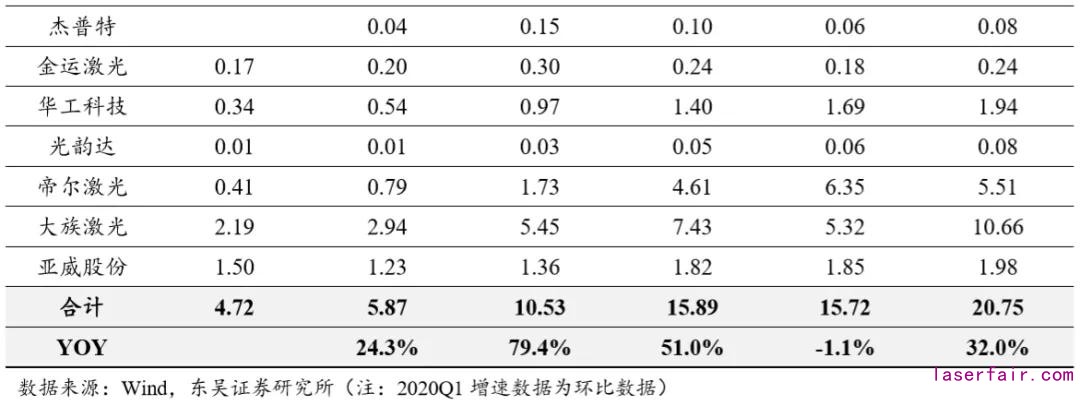 2020Q1受疫情影響業(ye) 績降幅較大。2020Q1激光板塊營收及淨利潤有所下滑,共實現營收33.3億(yi) 元,同比-29.1%,歸母淨利潤3.0億(yi) 元,同比-49.1%。業(ye) 績同比大幅下降主要是武漢光穀是我國目前最大的激光產(chan) 業(ye) 基地,受新冠疫情影響,部分企業(ye) 2月份完全停工停產(chan) 、訂單發貨和驗收受封城影響受阻。
