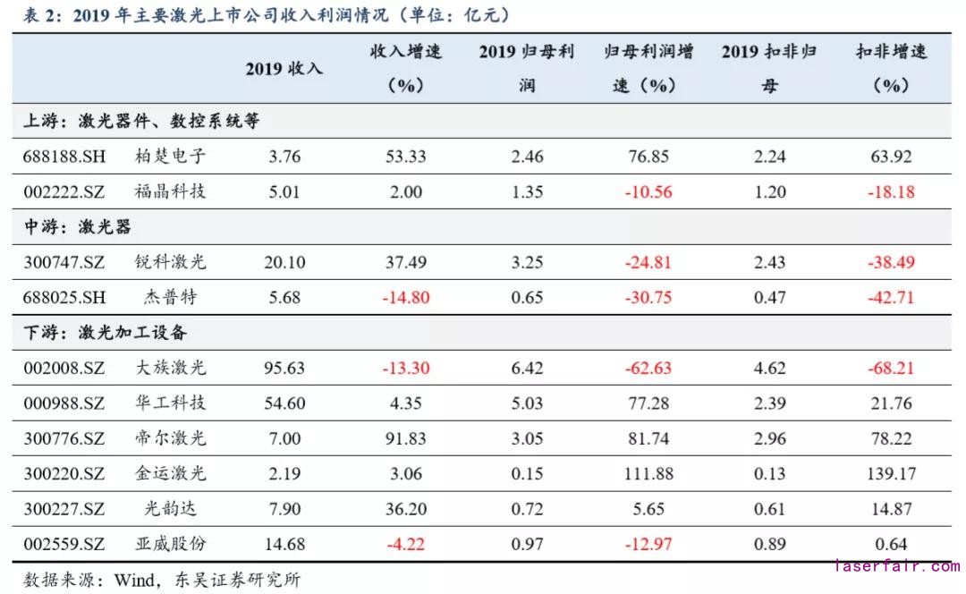 從(cong) 產(chan) 業(ye) 鏈來看,激光器承壓更為(wei) 明顯,激光加工設備受應用行業(ye) 不同出現分化。中遊激光器企業(ye) 銳科激光、傑普特和上遊激光晶體(ti) 企業(ye) 福晶科技業(ye) 績下滑幅度較大,我們(men) 認為(wei) 主要係激光器價(jia) 格戰導致公司營收和盈利能力承壓。下遊激光加工設備企業(ye) 華工科技、帝爾激光分別受益於(yu) 5G 投資力度加大、光伏行業(ye) 高增速,業(ye) 績表現靚麗(li) ,而部分激光加工設備企業(ye) 的業(ye) 績良好表現也帶動了激光切割設備數控係統龍頭柏楚電子整體(ti) 業(ye) 績高增。大族激光業(ye) 績大幅下滑主要係消費電子大客戶設備需求周期性下滑及中美貿易摩擦導致部分客戶資本開支趨於(yu) 謹慎。