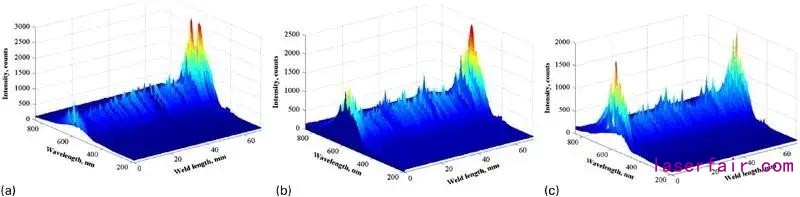 早期的研究表明,鋁合金的焊接缺陷,如咬邊和飛濺等,不僅(jin) 整個(ge) 光譜的輻射得到加強,就連鋁的譜線也同時得到加強。如在激光焊接鍍鋅板時,Zn(或Fe)的電子溫度同特征缺陷是明顯相關(guan) 聯的,此時溫度並不對焊接深度敏感。此外,羽狀物譜線的強度可以用來幫助識別焊接速度的變化,如圖3所示。