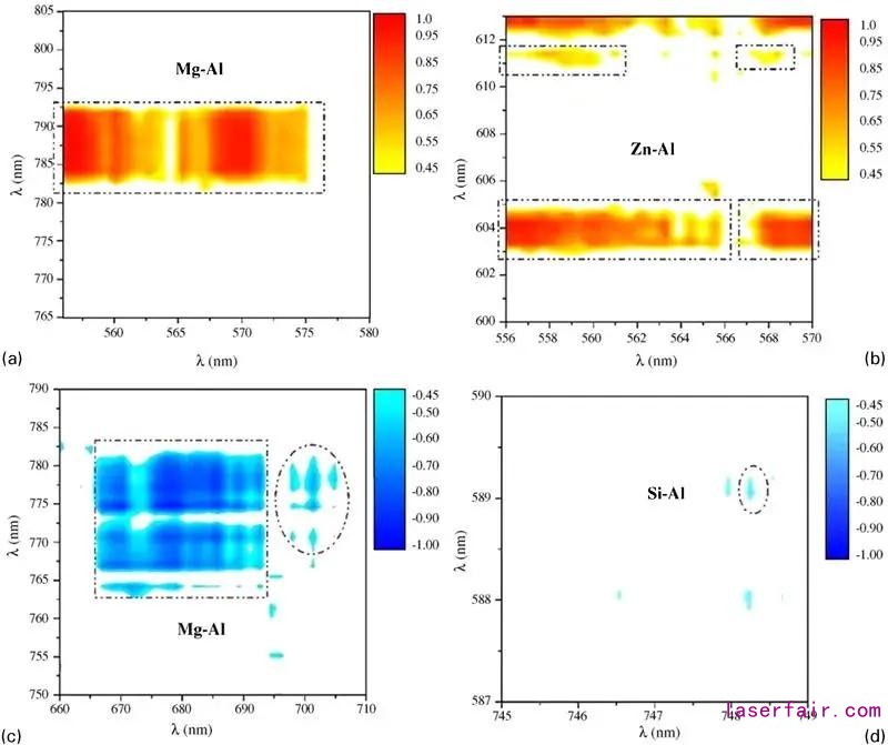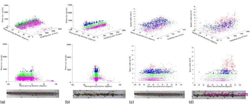 在Sibillano團隊的研究方案中,采用海洋光學的低成本光譜分析儀(yi) 進行缺陷探測和自適應控製的研究。基於(yu) 對光譜的相關(guan) 性分析,他們(men) 研究了不同保護氣體(ti) 速率的條件下的羽狀物的動力學特征,如圖4所示。圖4a和b為(wei) 氣體(ti) 流速為(wei) 40NL每分鍾的時候,其相關(guan) 性為(wei) 正。然而,如圖4c和d所示,當氣體(ti) 流速為(wei) 100NL每分鍾的時候,其相關(guan) 性為(wei) 負值。