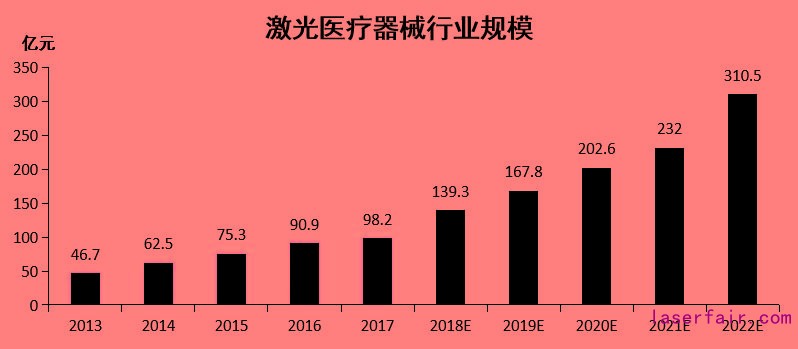 我國的激光醫療器械生產(chan) 從(cong) 上世紀90年代以來,年增長率高達20~30%,據中國產(chan) 業(ye) 信息網2017年的數據:激光醫療器械行業(ye) 2017年市場規模98.2億(yi) 人民幣,到2022年市場規模將達到310.5億(yi) 元人民幣。據密爾醫療調研與(yu) 分析,以上數據與(yu) 全球宏觀數據還有所出入,幾個(ge) 相對靠譜的數據是:2019年,全球激光醫療設備銷售額約70億(yi) 美元,年複合增速約13%;其中激光皮膚治療應用占比接近50%,年複合增速約14%;中國市場銷售占比約15%,整體(ti) 規模接近75億(yi) 元,年複合增速超過18%;fun88官网平台皮膚治療應用市場規模約30億(yi) 元,全球占比不超過12%。