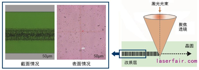 激光隱形切割作為(wei) 激光切割晶圓的一種方案,很好的避免了砂輪劃片存在的問題。如圖1所示,激光隱形切割是通過將脈衝(chong) 激光的單個(ge) 脈衝(chong) 通過光學整形,讓其透過材料表麵在材料內(nei) 部聚焦,在焦點區域能量密度較高,形成多光子吸收非線性吸收效應,使得材料改性形成裂紋。每一個(ge) 激光脈衝(chong) 等距作用,形成等距的損傷(shang) 即可在材料內(nei) 部形成一個(ge) 改質層。在改質層位置材料的分子鍵被破壞,材料的連接變的脆弱而易於(yu) 分開。切割完成後通過拉伸承載膜的方式,將產(chan) 品充分分開,並使得芯片與(yu) 芯片之間產(chan) 生間隙。這樣的加工方式避免了機械的直接接觸和純水的衝(chong) 洗造成的破壞。目前激光隱形切割技術可應用於(yu) 藍寶石/玻璃/矽以及多種化合物半導體(ti) 晶圓。