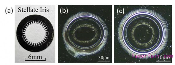 研究人員利用材料損傷(shang) 和激光能流密度的依賴關(guan) 係,通過高強度光絲(si) 燒蝕材料形成的燒蝕痕跡,記錄光絲(si) 內(nei) 部能流通量的特征信息,實現了光絲(si) 核心區域徑向能流通量及其沿光絲(si) 縱向分布的精密測量。通過該方法,再現了基於(yu) 光闌調控入射激光對成絲(si) 核心區域能量分布的調控作用。研究發現,同普通圓形光闌相比,利用新型星形光闌可以獲得更高能流通量和等離子體(ti) 密度的空氣光絲(si) ,並且實驗結果與(yu) 基於(yu) 非線性薛定諤方程的數值模擬相符。該項研究成果推動了飛秒激光成絲(si) 過程光絲(si) 內(nei) 部激光能流通量分布的精密測量、調控及其相關(guan) 應用的研究。