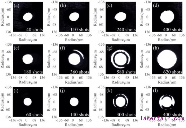 圖2 激光光絲(si) 燒蝕形成的微孔:(a)-(d) 、(e)-(f)和(i)-(l)分別對應沒加小孔、加圓孔光闌和加星形光闌調控下激光成絲(si)