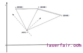 鐳神AGV/叉車反光板導航係統,通過在行駛路徑周圍安裝用於(yu) 精確位置定位的激光反光板,由AGV/叉車發射激光束,同時采集由反光板反射的激光束,來確定其當前的位置和方向(利用激光雷達精確的測距和測角信息及對特定發光板的強度信號提取,並匹配環境中已知的反光板的位置,然後再根據匹配的反光板的數據采集至少3塊最近的反光板位置信息,通過三點定位算法來精確計算當前AGV/叉車激光雷達位置信息x,y,Ɵ),通過連續的三角幾何運算來實現對AGV/叉車的精確定位。