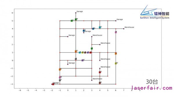 在保證實時性的情況下,鐳神自研的調度算法已經能夠在算法模擬裏做到上百台,支持目前大部分的物流倉(cang) 儲(chu) 應用場景,多機調度係統將根據不同場景的貨物堆放和布局來合理規劃AGV、無人叉車的作業(ye) 調度,保證在同樣的任務中達到更大的效率。