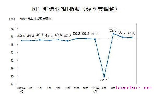 5月31日,國家統計局與(yu) 中國物流與(yu) 采購聯合會(hui) 聯合發布的5月份中國製造業(ye) 采購經理指數(PMI)為(wei) 50.6%,較上月小幅下降0.2個(ge) 百分點,保持在50%榮枯線以上。