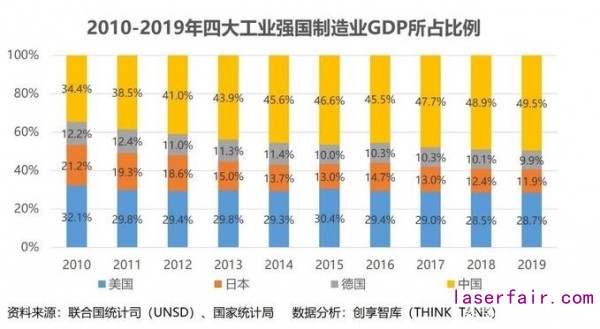 2019年,中國製造業(ye) GDP增長5.7%,與(yu) 美國、日本、德國等其他三國的製造業(ye) GDP出爐時,同樣沒有懸念;中國依然遙遙領先,達到4.23萬(wan) 億(yi) 美元,美國是2.45萬(wan) 億(yi) 美元,德國是0.85萬(wan) 億(yi) 美元,日本是1.02萬(wan) 億(yi) 美元;也就是說,中國製造業(ye) GDP已經接近美,日,德三國之和。