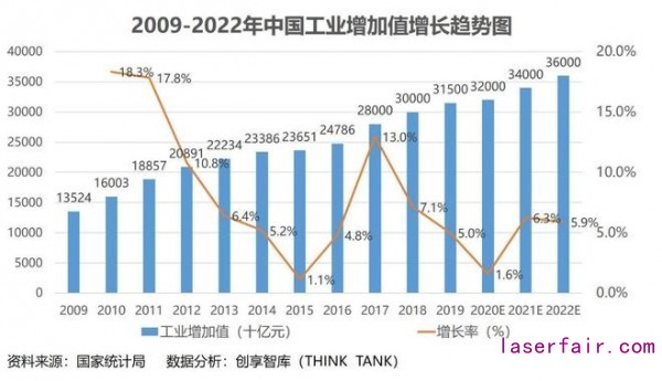 2019年中國工業(ye) 增加值達到31.5萬(wan) 億(yi) 元,並繼續保持全球第一。2009年至2019年這11年間,工業(ye) 增加值從(cong) 13.5萬(wan) 億(yi) 元增長到31.5萬(wan) 億(yi) 元,年均複合增長率(CAGR)8.8%,略低於(yu) 同期GDP一個(ge) 百分點(2009年34.9萬(wan) 億(yi) 元,2019年99.0萬(wan) 億(yi) 元,CAGR9.8%);基於(yu) 2020年疫情之下,預估在2022年,工業(ye) 增加值將突破36萬(wan) 億(yi) 元。