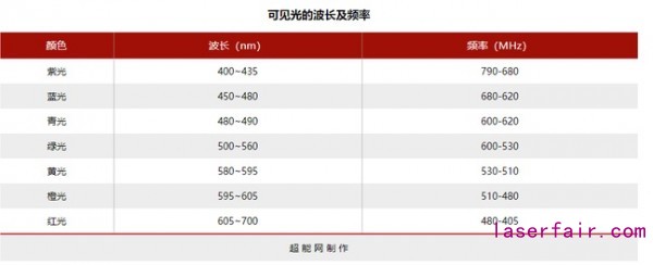 圖中水平的兩(liang) 條橫線E2和E1表示電子的能級,越高表示電子的能量越高(VIP 等級越高),左邊自發輻射電子從(cong) 高能級向低能級躍遷,同時輻射出一個(ge) 能量等於(yu) 兩(liang) 能級能量差的光子;而受激輻射則是在外加光子的作用下,輻射出一個(ge) 完全一樣的光子,這就是所謂“受激”的過程。這裏再補充一下, hν在是一個(ge) 光子的能量,其中h是普朗克常數,可以不用管它,而ν則是光的頻率,它直接決(jue) 定了我們(men) 看到的光的顏色,每一個(ge) 頻率都對應著一個(ge) 確定的顏色,下表列舉(ju) 了可見光所對應的頻率和波長範圍(波長和頻率也是一一對應的)。我們(men) 可以看到,紅橙黃綠青藍紫,光的頻率是逐漸增高的,這也就是為(wei) 什麽(me) 我們(men) 生活中看到溫度越高的光源,其顏色越偏向藍色。
