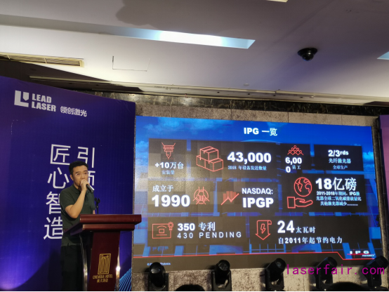 接下來領創激光戰略合作夥(huo) 伴,全球領先的激光器製造商IPG馬小龍先生詳細的介紹了公司的發展曆程和產(chan) 品特點,他在介紹中講到,IPG產(chan) 品的發展理念是穩定、高效、節能、環保,這與(yu) 領創激光的產(chan) 品理念不謀而合,因此兩(liang) 家公司一直緊密合作,建立聯合實驗室,為(wei) 客戶不斷的提高更優(you) 質的激光加工技術服務。