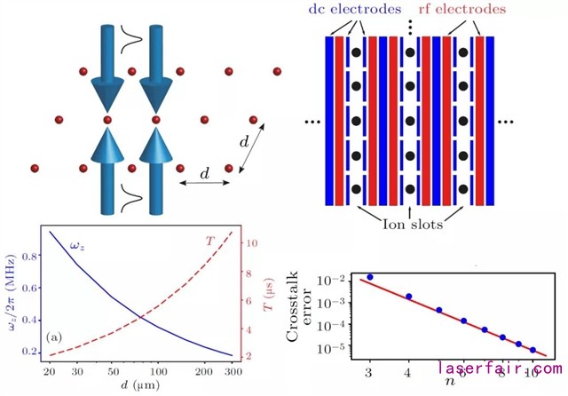 左上:在二維離子陣列上使用反向傳(chuan) 播的脈衝(chong) 激光實現近鄰離子間雙量子比特邏輯門的示意圖;右上:一種基於(yu) 芯片微加工技術實現二維離子陣列的示意圖,離子在dc和rf電場中排列成一維鏈,多個(ge) 一維鏈進而組成二維陣列;左下:以鐿-171離子為(wei) 例,所需的簡諧約束勢大小(藍色實線)和雙量子比特邏輯門時間(紅色虛線)隨離子間距d的變化;右下:並行執行多個(ge) 邏輯門的串擾誤差隨邏輯門之間的距離n的變化。