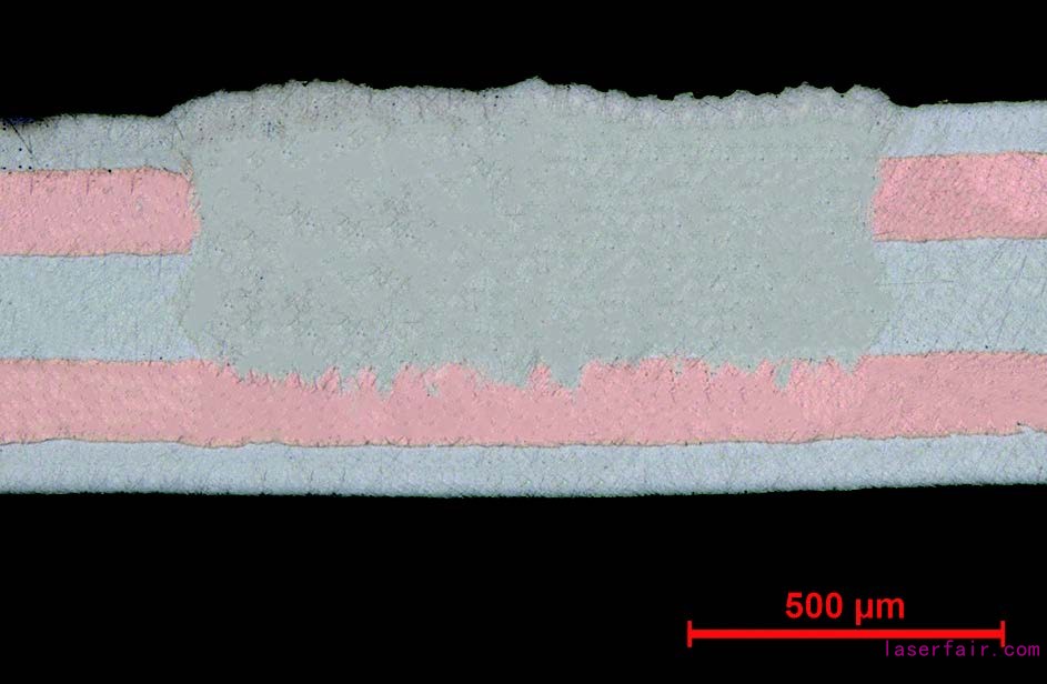 納秒脈衝(chong) 光纖激光器的峰值功率較高,意味著可以較容易地以很小的平均功率進入銅等高反金屬中。使用納秒微焊接工藝作為(wei) 焊接的一種替代方法,將元件直接貼合在銅印刷電路板(PCB)軌道上的研究顯示出了巨大的前景。目前已經成功將厚達150μm的銅引線貼合到>60μm的沉積軌道上,而與(yu) FR4基板之間沒有任何明顯的分層。這為(wei) 熱敏元件或工作溫度可能超過傳(chuan) 統焊接極限的元件的貼合提供了替代方案。