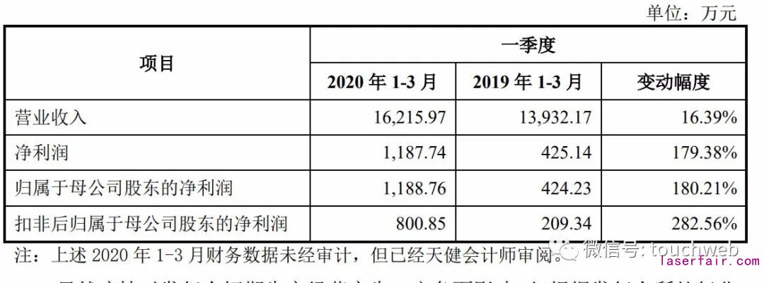 聯贏激光2020年1-3月營收為(wei) 1.62億(yi) 元,較上年同期增加2,283.80萬(wan) 元;歸屬於(yu) 母公司股東(dong) 的淨利潤1188萬(wan) 元,較上年同期增加764萬(wan) 元,實現扣除非經常性損益後歸屬於(yu) 母公司股東(dong) 淨利800萬(wan) 元,較上年同期增加591萬(wan) 。