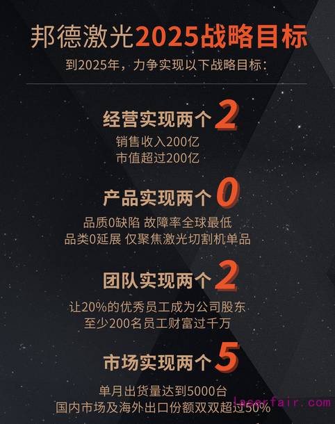邦德激光致力於(yu) 打造“全球激光切割機行業(ye) 第一品牌”,在2020年這一全球經濟發展的轉折年,邦德激光將抓住機遇,製定2025戰略目標。而轉戰“科創板”或A股其他板塊,是邦德激光實現這一戰略目標的重要步驟。